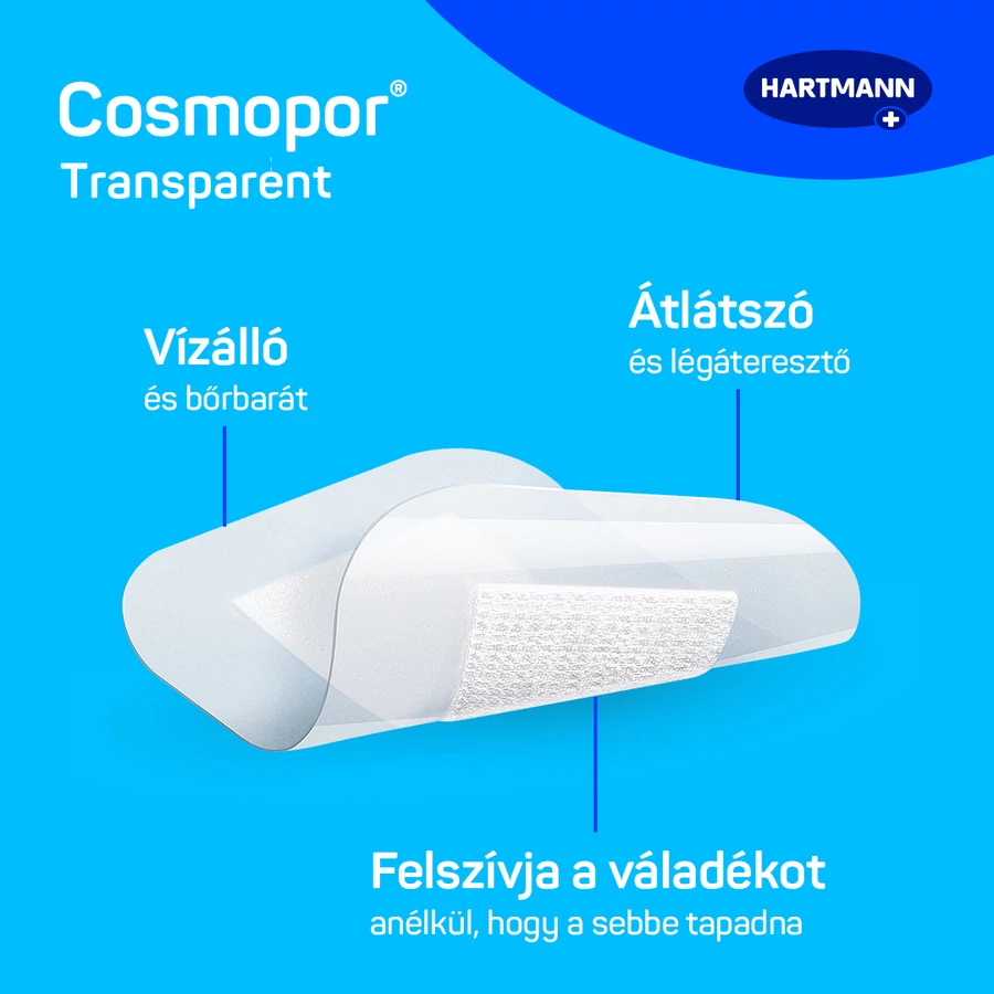 A Cosmopor® Transparent átlátszó, öntapadó, lekerekített sarkú sebkötszer; viszkóz alapanyagú (sebbe nem tapadó polietilén hálóval ellátott) nedvszívó párnával, amely nem ragad a sebbe.