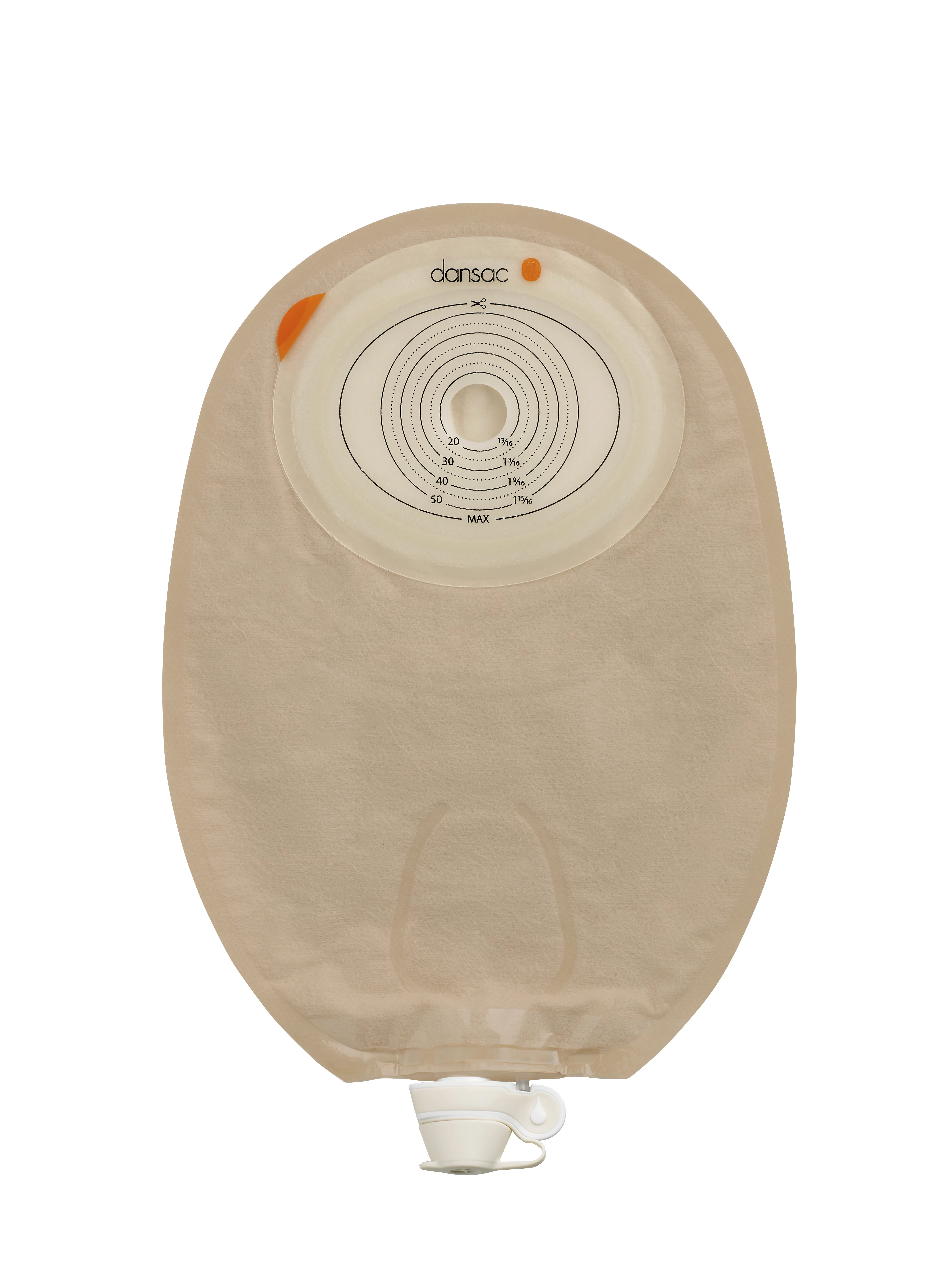 Dansac NovaLife TRE 1 Urostomy, egyrészes, testszínű, ablakos sztómazsák, méretre kivágható 15-55x-70 mm, 235 ml, vízlepergető borítással.