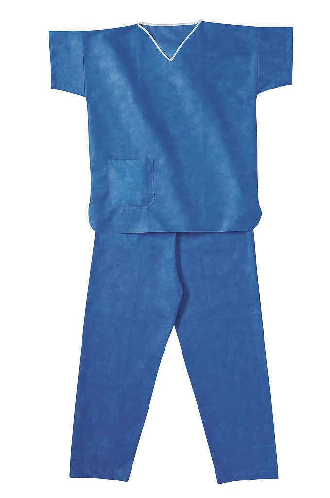 Egyszer használatos zsilipruha, kék, tunika és nadrág egybecsomagolva.Tunika zsebekkel ellátott V nyakkivágással nadrág derékmegkötôvel rendelkezik