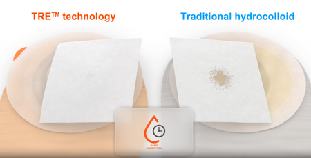 A TRE™ tapadófelületek gyors nedvszívásának titka egy keresztkötött, hidrofil polimer, amely saját tömegének akár 500-szorosát képes folyadékból felvenni, miközben hidrogélt képez⁴. Az így létrejövő stabil gélstruktúra még nyomás alatt is biztonságosan megköti a nedvességet⁴.