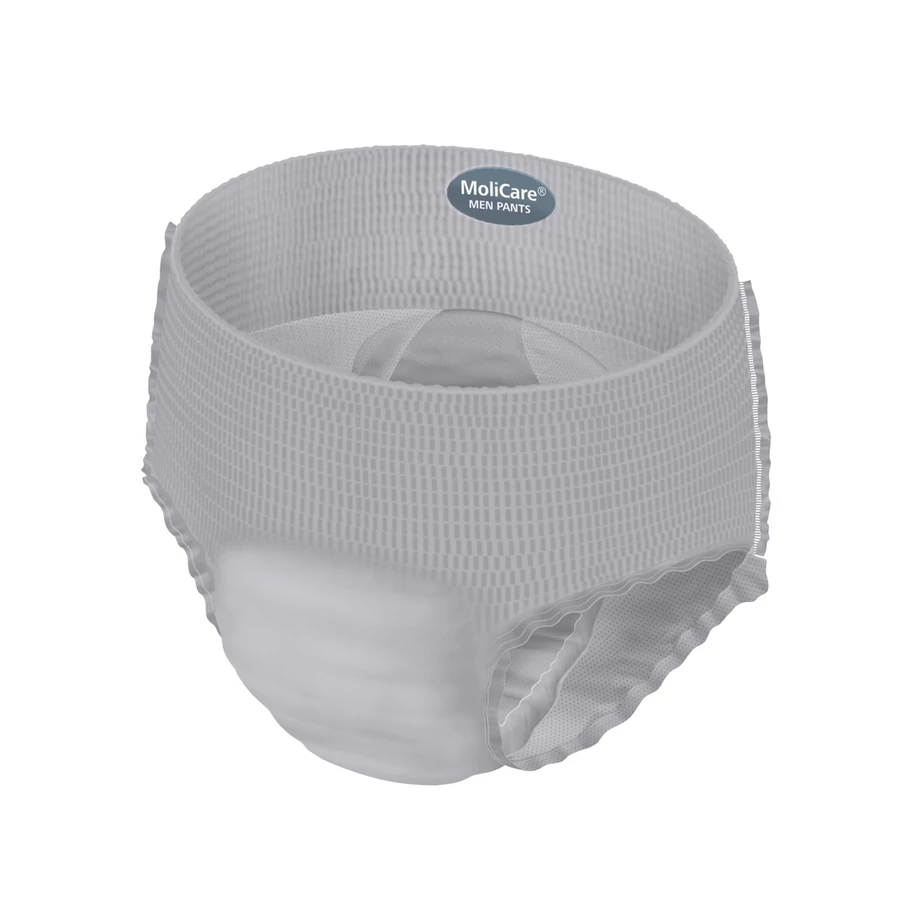 A MoliCare® Premium MEN pants nedvszívó fehérnemű hasonlít a hétköznapi fehérneműkhöz, anatómiai formája, puha anyaga és könnyed derékgumírozása kényelmes és diszkrét viseletet nyújt. A felső fehér csavart rostos cellulózréteg antibakteriális és pH5.5 bőrsemleges értékű, így fenntartja a bőr egészségét. A felső, bőrrel érintkező felülete Aloe Verával impregnált. A MoliCare® Premium MEN pants nedvszívó fehérnemű bőrgyógyászatilag tesztelt. A nedvszívó párna semlegesíti a kellemetlen szagokat és a nedvességet gyorsan magába szívja, így a párna felső része száraz érzést biztosít. A maximális biztonságot a kiváló minőségű alapanyagok és a kifolyás elleni védelem nyújtja. Viselete megegyezik a fehérneműk használatával, könnyen fel- és lehúzható. Könnyű használata ideális az aktív hólyagproblémákkal küzdő egyének számára, akik a MoliCare® Premium MEN pants nedvszívó fehérneműk segítségével önálló életmódjukat folytathatják.